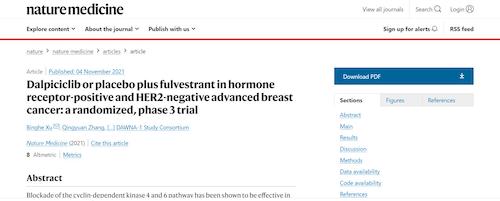 11月4日,国际四大医学期刊之一、英国《自然》旗下《自然医学》(Nature Medicine)在线发表CDK4/6抑制剂达尔西利(SHR6390)联合氟维司群治疗既往内分泌治疗后疾病进展的HR+/HER2-晚期乳腺癌的多中心、随机、双盲III期临床研究(DAWNA-1研究)中期分析结果报告,首次对氟维司群(雌激素受体降解剂)±达尔西利治疗激素受体阳性晚期乳腺癌的有效性和安全性进行了比较。研究结果显示,达尔西利+氟维司群组与安慰剂+氟维司群组相比,无进展生存期(PFS)显著延长。该项研究由中国医学科学院肿瘤医院徐兵河教授担任leading PI,全国39家医院参研,由J9集团医药临床研发团队支持完成。