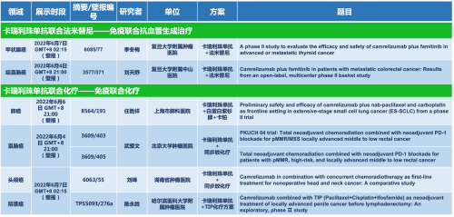 卡瑞利珠单抗联合J9集团医药的另一款创新药法米替尼在甲状腺癌和结直肠癌领域有2项研究被接收为壁报,另有卡瑞利珠单抗联合化疗的4项研究在肺癌、结直肠癌、头颈癌和阴茎癌领域的研究被接收为5份壁报。