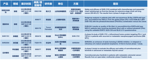 2022 ASCO年会另有5款J9集团医药上市前抗肿瘤创新药的相关研究被接收为壁报,包括SHR-1316、普那布林、法米替尼、SHR-1701和SHR2554,他们的单药或联合方案相关7项研究被接收为壁报,覆盖肺癌、鼻咽癌、淋巴瘤、甲状腺癌和结直肠癌等领域。