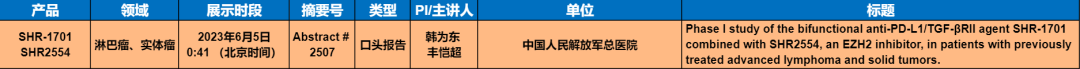由中国人民解放军总医院韩为东教授、丰恺超教授团队开展的“双功能抗PD-L1/TGF-βRII药物SHR-1701联合EZH2抑制剂SHR2554治疗经治的晚期淋巴瘤和实体瘤患者I期研究”成功入选口头报告。