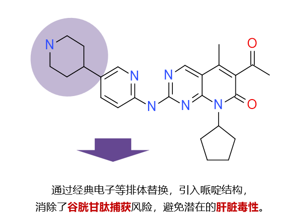 达尔西利在项目立项之初,研发者就希望能够降低药物的肝毒性。在结构设计中,通过经典的电子等排体替换引入哌啶基团,从而有效地消除谷胱甘肽捕获风险(图1),这成为了达尔西利最大的设计亮点之一。临床相关研究中,可以看到达尔西利相关的3~4级AST升高的发生率仅为0.4%,3~4级ALT升高的发生率甚至为0。