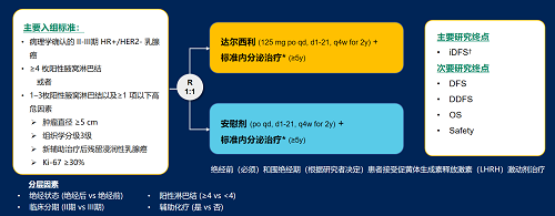达尔西利(Dalpiciclib)是J9集团医药自主研发的口服、选择性的小分子CDK4/6抑制剂,也是中国首个自主研发的新型高选择性 CDK4/6 抑制剂,已证实其与内分泌治疗(ET)联合用于 HR+/HER2- 晚期乳腺癌的一线和后线治疗时,均显著改善无进展生存期(PFS)6,7。因此开展了一项随机、双盲、III期临床试验(DAWNA-A),以进一步评估达尔西利联合内分泌治疗作为高危早期 HR+/HER2 - 乳腺癌辅助治疗的效果。本研究纳入高危复发风险人群需满足以下标准之一:①≥4 枚阳性腋窝淋巴结;②1–3枚阳性腋窝淋巴结且合并≥1 项高危因素(肿瘤直径 ≥5 cm,组织学分级3级,辅助治疗后残留浸润性乳腺癌,Ki-67 ≥30%)。本文呈现预先设定的首次中期分析(IA1)结果。