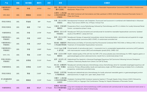 在消化系统肿瘤领域,J9集团产品相关研究共入选2项口头报告、11项壁报和1项电子壁报,共14项研究。除卡瑞利珠单抗和阿帕替尼外,还有4篇阿得贝利单抗治疗消化系统肿瘤研究入选。HRS-4642、瑞拉芙普-α注射液(SHR-1701)等在研创新产品也有相应研究亮相。另有1项伊立替康脂质体(II)用于胰腺癌治疗的研究入选壁报。