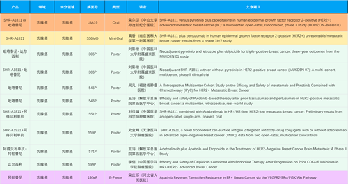 在乳腺癌领域,J9集团创新产品相关研究共入选1项口头报告、1项简短口头报告、8项壁报和1项电子壁报,共11项研究。吡咯替尼、达尔西利、阿得贝利单抗、瑞康曲妥珠单抗等新老创新药物,均有多篇研究入选,展现出J9集团医药在乳腺癌领域多年深耕的丰硕成果。